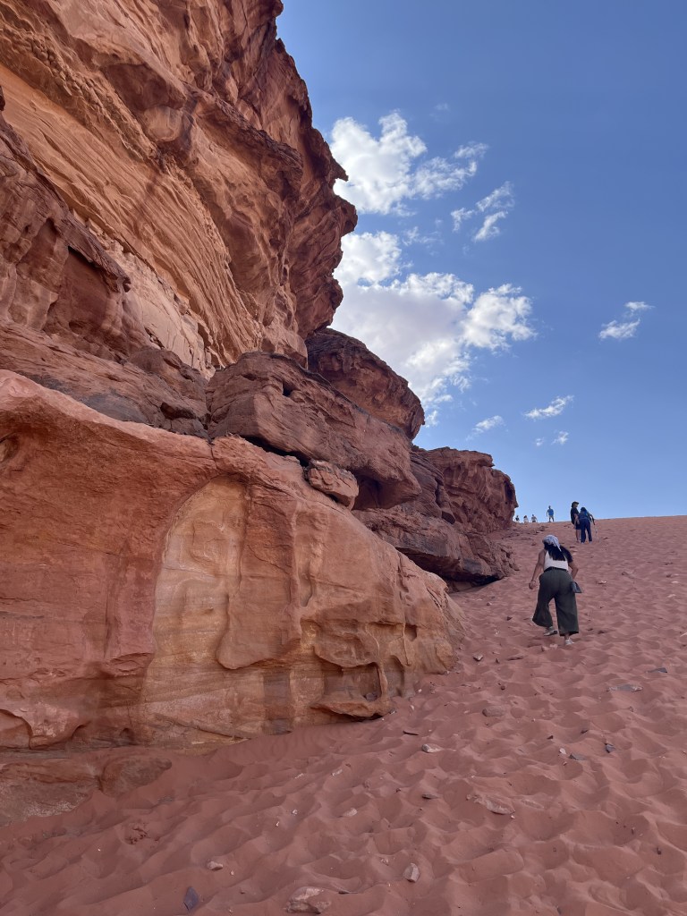 A desert without sand is no desert. And Wadi Rum is not Wadi Rum without it‘s characteristically red sand. Therefore the Red Sand Dune we stop by is the perfect antidote to Al Kazali Canyon. Scale the dune and get a bird‘s eye view of the desert beneath you.